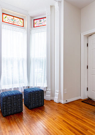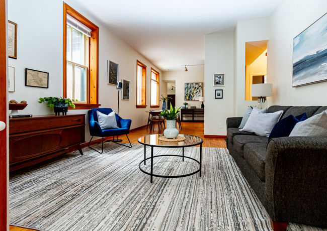 This spacious main floor end unit offers open concept living and dining areas with soaring ceilings, pine flooring and large windows. 2 bedrooms and 1.5 bathrooms are found at the rear of the unit along with laundry and extra sitting area. This unit enjoys an exclusive use fenced garden, basement for ample storage and foyer with powder room. 2 tandem parking spaces round out this terrific offering.